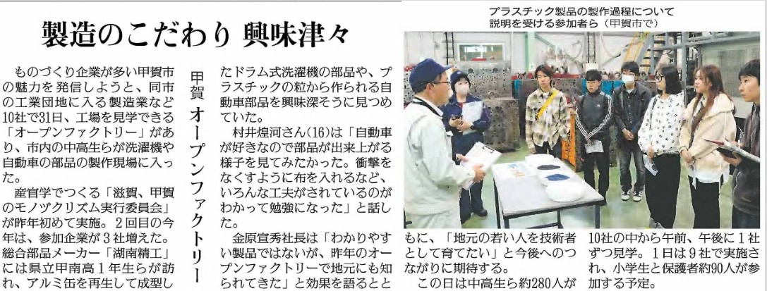 読売新聞様に取り上げていただきました!『製造のこだわり 興味津々 甲賀 オープンファクトリー』 お知らせ 2025年11月1日(土)の読売新聞様の記事に、10月31日(金)に開催された地域一体型オープンファクトリー『滋賀、甲賀のモノヅクリズム』の湖南精工での工場見学の様子を掲載していただきました! ありがとうございます! 一覧に戻る